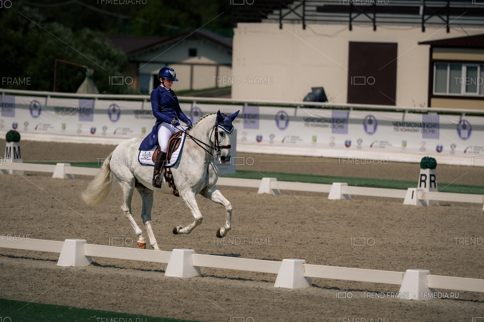 Фотография Евразийских Игр 2025 в Maxima Park: всадница в классическом синем костюме и белая лошадь во время программы по выездке. Эстетика конного спорта, баланс и красота движения. Авторская работа TrendFrame.